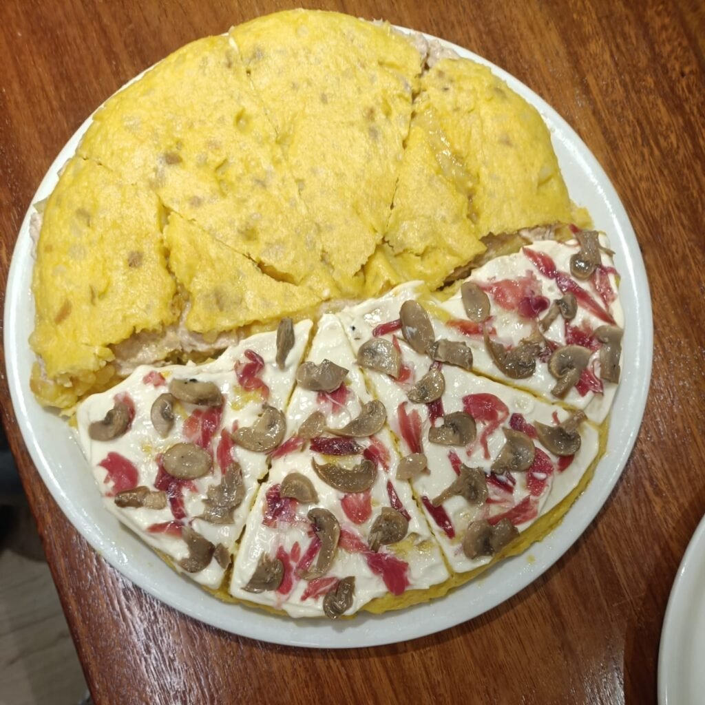 El toque de la tierra. Jugosa tortilla cubierta con láminas de champiñón y virutas de jamón sobre una base suave.